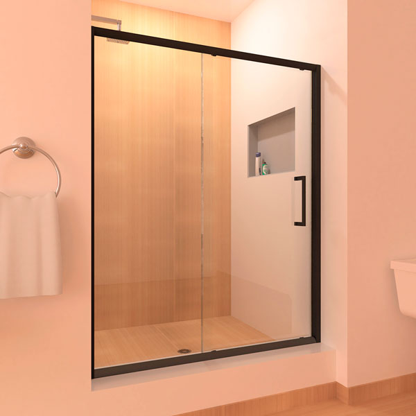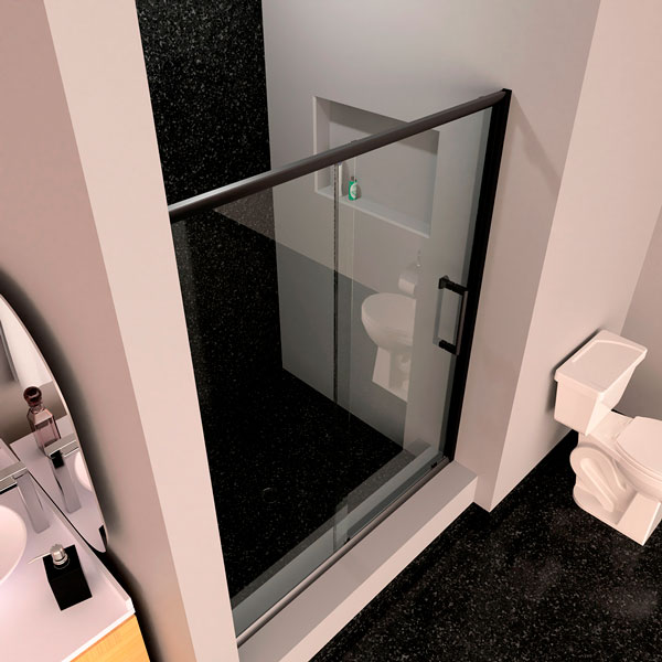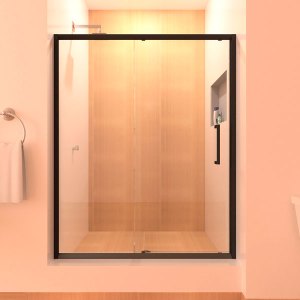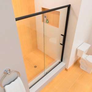 Este sistema de puertas de baño en kit listo para instalar es un modelo de puerta corrediza que tiene las siguientes características: