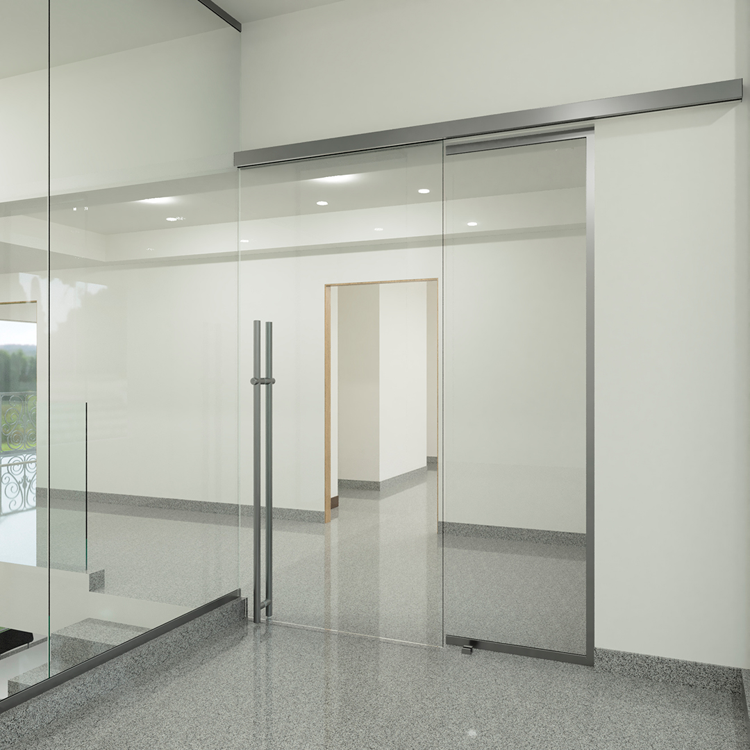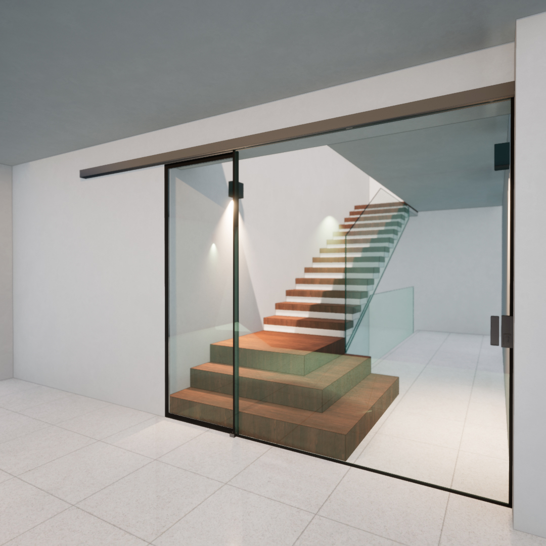 El sistema Slider invisible incluye componentes de máxima calidad: rodamientos inferiores y superiores regulables, con carcasa en hierro galvanizado y mecanismo tándem, que aseguran un deslizamiento suave, silencioso y seguro. Los dampers superiores, elaborados en PVC, garantizan un cierre controlado que evita golpes bruscos y prolonga la vida útil del sistema. Su capacidad de carga de hasta 60 kg permite instalar hojas de vidrio de generosas dimensiones, con un ancho máximo de 860 mm y una altura de hasta 2600 mm, lo que brinda una presencia visual imponente y ligera a la vez.