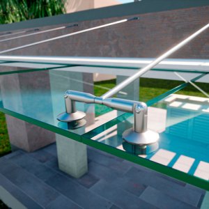 Los accesorios empleados para la instalación están fabricados en acero inoxidable y aluminio de alta calidad en acabado satinado. En primer lugar, para el caso de los sistemas canopy, el material principal empleado para el techo es el vidrio templado y en segundo lugar, para el caso de los sistemas de policarbonato, como su nombre lo indica, el material empleado es el policarbonato.